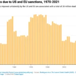 The US and Europe have dramatically increased their use of sanctions. During the 1990s and 2000s, an average of 30 countries were under Western unilateral sanctions in any given year. And now, as of the 2020s, it is more than 60 – a strikingly high proportion of the countries of the Global South. Sanctions often have a huge human toll. Scholars have demonstrated this in several well-known cases, such as the US sanctions against Iraq in the 1990s that led to widespread malnutrition, lack of clean water, and shortages of medicine and electricity. More recently, US economic warfare against Venezuela has resulted in a severe economic crisis, with one study estimating that sanctions caused 40,000 excess deaths in just one year, from 2017 to 2018. The results are staggering. In their central estimate, the authors find that unilateral sanctions imposed by the US and EU since 1970 are associated with 38 million deaths. In some years, during the 1990s, more than a million people were killed. In 2021, the most recent year of data, sanctions caused more than 800,000 deaths.