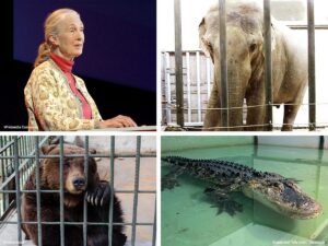 I have mixed feelings on zoos. In a perfect world, all animals should be free and protected. Our reality is much different however, considering the shortcomings of our species. Zoos can protect those who are endangered, and educate children, but they can also be prisons that cause immense suffering and psychological damage to animals. Also, if your favorite zoo sells animal products like cheeseburgers, fried chicken, and ice cream in its restaurants and concession stands, then it is truly not committed to protecting animals and our only planet (let alone your personal health). Here is what Ms. Goodall had to say on the subject of zoos: “I’m always being asked again and again, “Jane, what do you think of zoos?” Groups who believe all zoos should be closed clearly have not spent the time I have out in the wild. They haven’t seen the threats destroying chimpanzee habitat; they don’t understand what it’s like to watch a chimp struggle, wounded and lame from a wire snare. But I do. I remember sitting with a group of chimps in an American zoo once. They had a really nice enclosure and I was watching the adults groom each other and the young ones play. As I watched, I remember thinking of the chimpanzee groups I had seen in the wild who are living day to day in fear. Put yourself in the position of chimpanzees for a minute. A chimp living in a zoo where people know them, love them, understand them and protect them or a chimp in the wild who may have lost their mother the week before, watching another member of the troop as they’re wounded by a bullet from a poacher. Which would you rather be? I’d rather be in the group in the zoo. And certainly in the group here at Monarto Zoo; now that’s a good life for a chimp.”