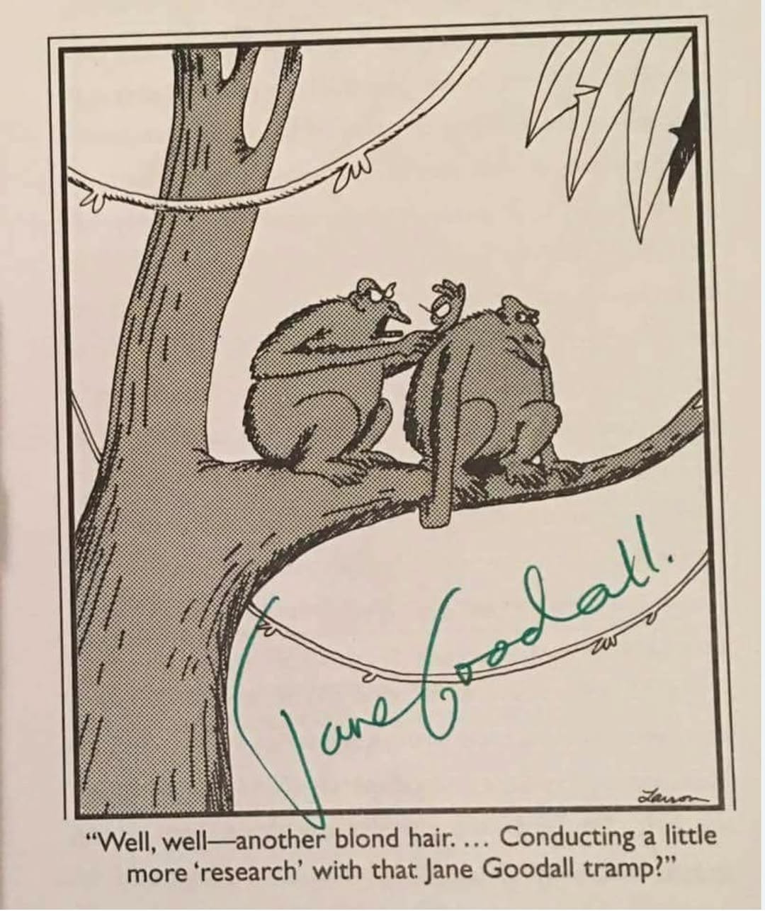 Lastly, it seems that Jane Goodall enjoyed a good laugh too. Leave it to the great Gary Larson, to help us keep things in perspective (lest we begin to take ourselves too seriously). This cartoon still cracks me up, especially with the approving signature of Jane Goodall herself!
