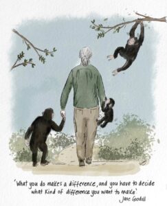 “When I was a little girl, I used to dream as a man, because I wanted to do things that women didn’t do back then such as traveling to Africa, living with wild animals and writing books,” said Dr. Jane Goodall. “I didn’t have any female explorers or scientists to look up to but I was inspired by Dr. Dolittle, Tarzan and Mowgli in The Jungle Book — all male characters. It was only my mother who supported my dream: ‘You’ll have to work hard, take advantage of opportunities and never give up,’ she’d tell me. I’ve shared that message with young people around the world, and so many have thanked me, and said, ‘You taught me that because you did it, I can do it too.” – Jane Goodall (2018)