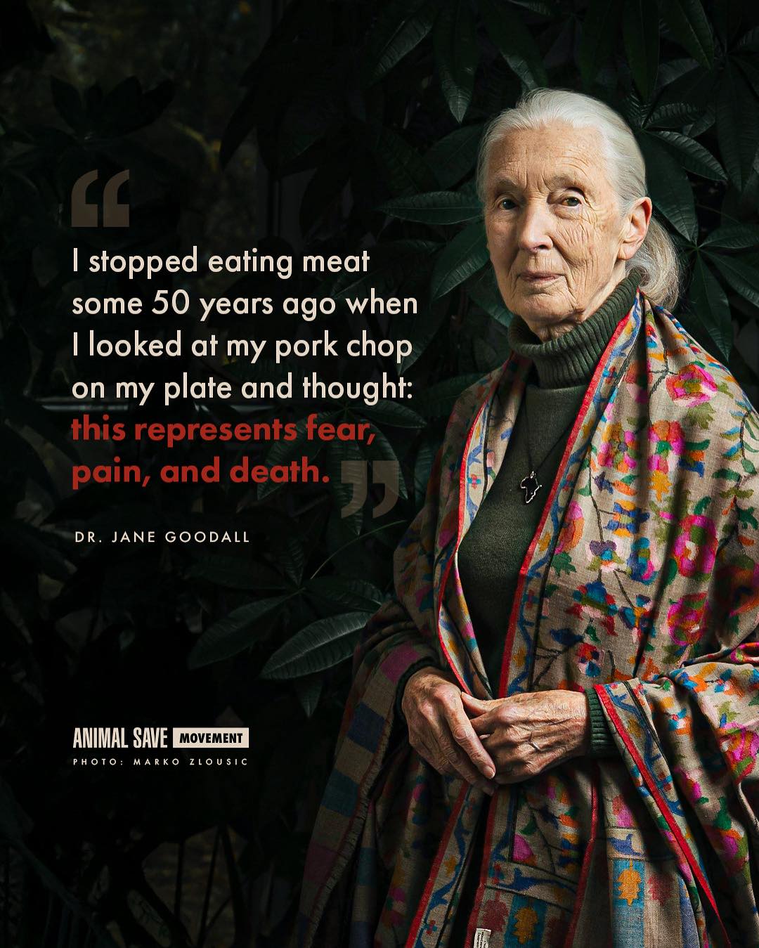 “Dr. Jane Goodall chose compassion over violence decades ago when she realized the life behind the food on her plate. Her choice is a reminder that we all have the power to stop suffering – simply by what we put on our plates. Go vegan like Dr. Goodall did. For the animals.” – Animal Save Movement