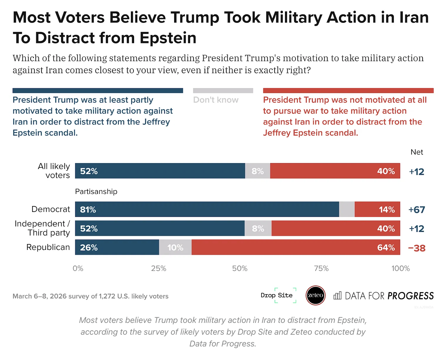 “A majority of likely American voters believe that “Donald Trump launched the war on Iran at least in part to distract from the Jeffrey Epstein scandal” that had engulfed his presidency. The survey found that a solid 52-40 majority of voters agreed with the statement, with the other 8% saying they were unsure as to his motivations. The findings will come as little surprise to a public that has morphed Trump’s codename for the war, Operation Epic Fury, into “Operation Epstein Fury.””