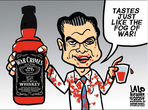 For the record, US Secretary of War Crimes, Pete Hegseth is a mass murdering psychopath. According to the always excellent journalist Ben Norton, “Trump’s Defense Secretary Pete Hegseth is a self-declared “crusader” who believes the USA is in a “holy war” against China, the left, and Islam. “Communist China will fall”, he vowed in his 2020 book “American Crusade”, promising, “Israel and America will form an even tighter bond, fighting the scourge of Islamism and international leftism”.